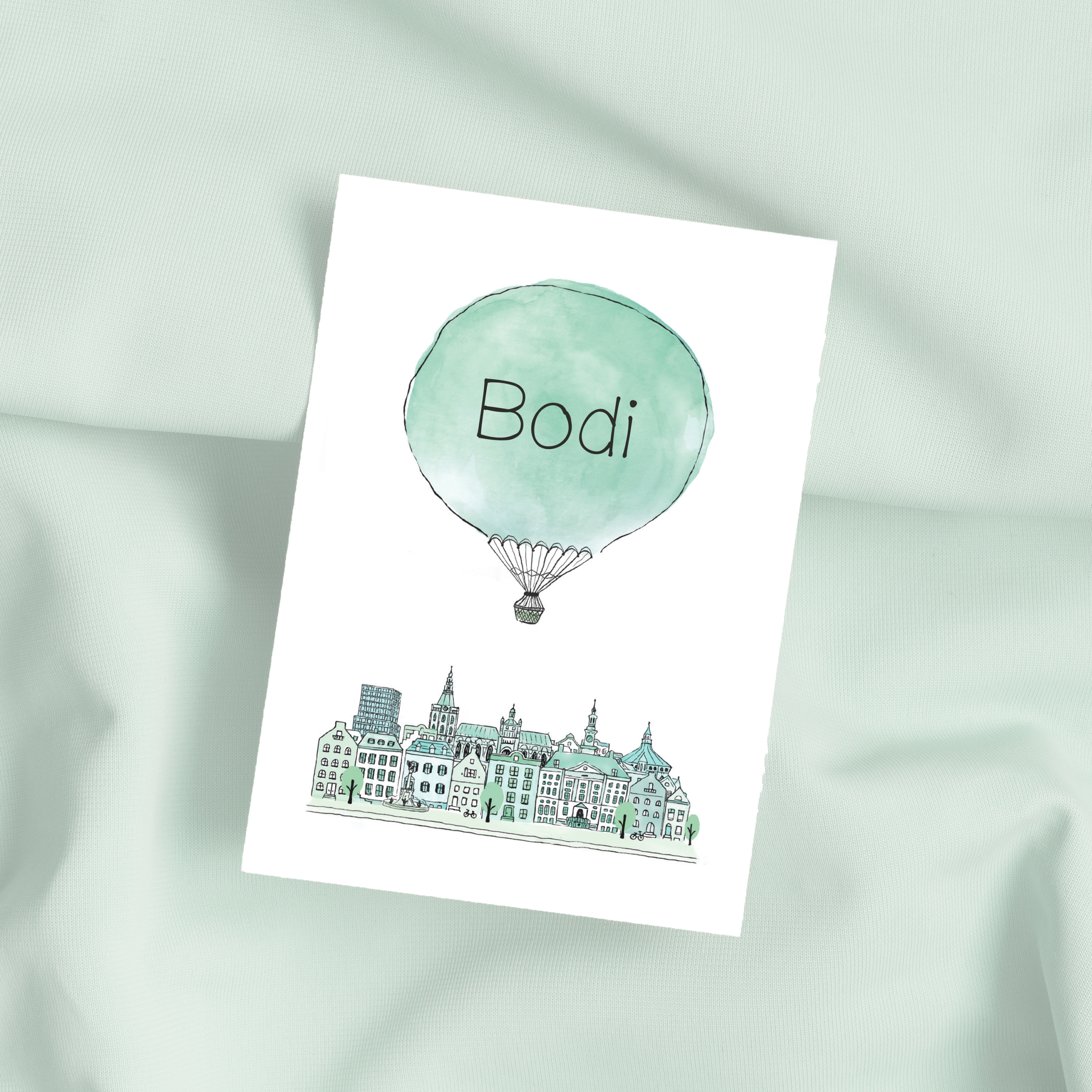 Een uniek geboortekaartje met luchtballon en de skyline van de stad Den Bosch / ’s Hertogenbosch, met de hand getekend. Een echt unisex geboortekaartje in mooie lichtgroene en -blauwe kleuren. Dit geboortekaartje is gedrukt op stevig en luxe gebroken wit papier met structuur. Het (standaard) formaat is een gevouwen kaartje (10,5 x 14,8 cm wanneer gevouwen).