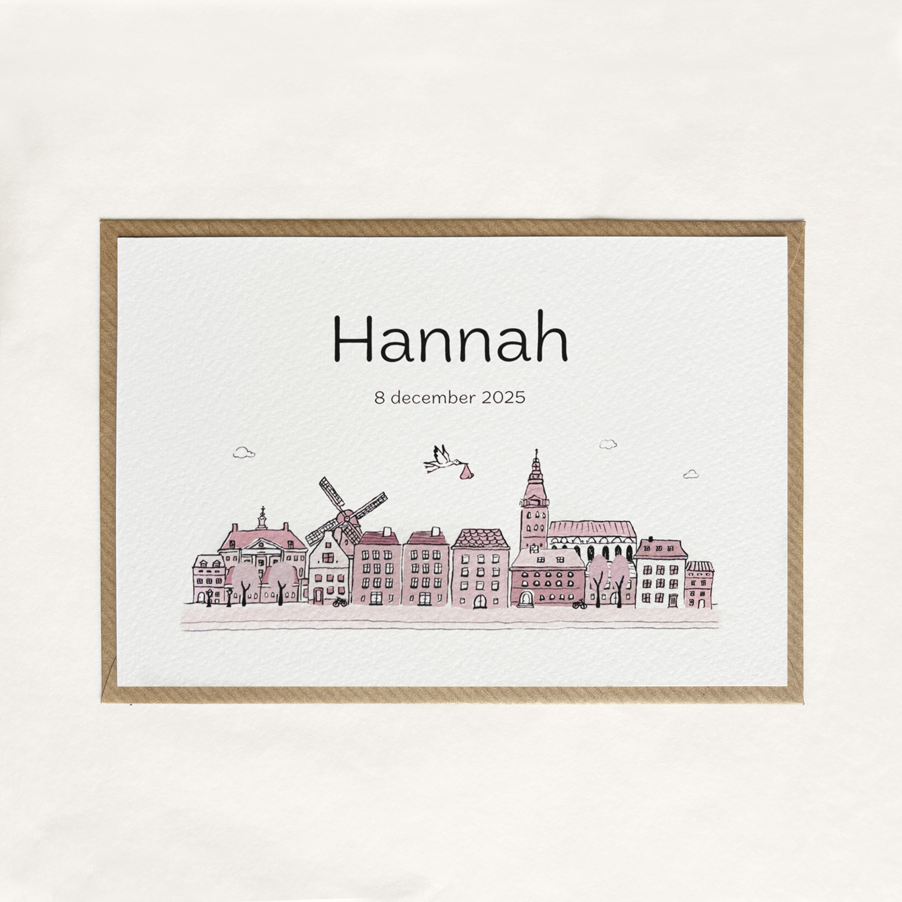Een leuk, authentiek geboortekaartje met skyline illustratie. Prachtige combinatie van een mooi, gedetailleerde pen tekening en aquarel kleurendetails. Dit geboortekaartje is gedrukt op stevig en luxe gebroken wit papier met structuur. Het (standaard) formaat is een enkel liggend kaartje (17 x 11 cm).