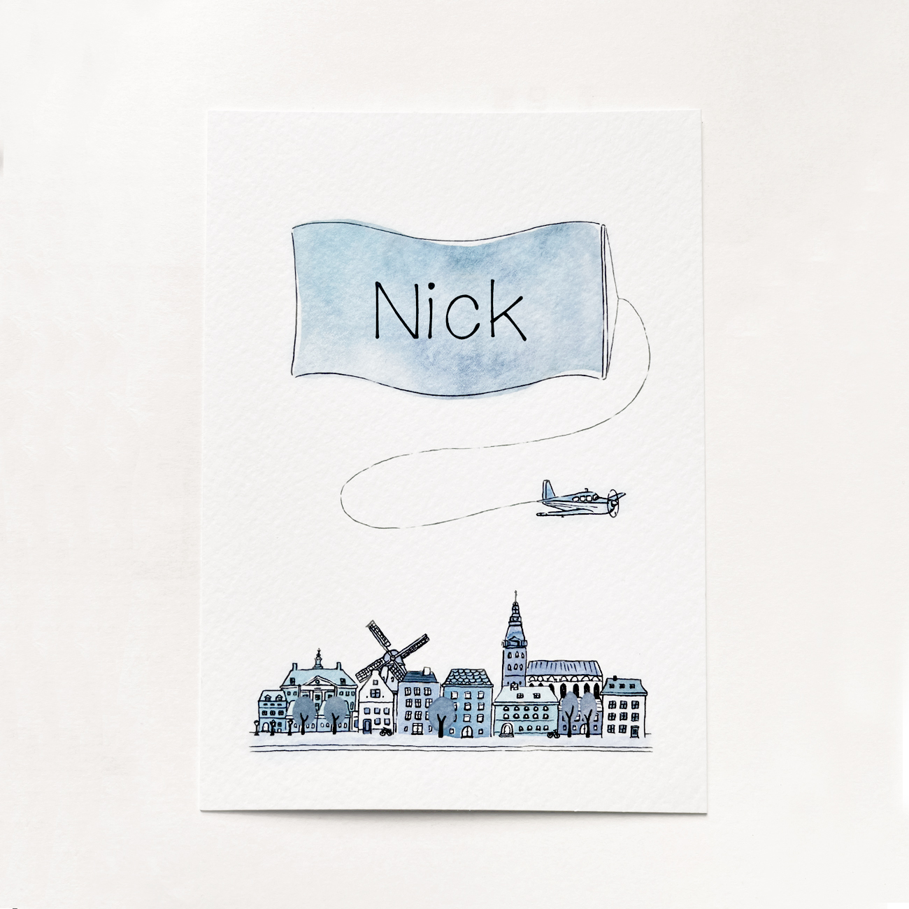 Een leuk, authentiek geboortekaartje van een skyline en vliegtuigje met spandoek waarop de naam van je kindje wordt gedrukt. Prachtige combinatie van een mooi, gedetailleerde pen tekening en aquarel kleurendetails. Dit geboortekaartje is gedrukt op stevig en luxe gebroken wit papier met structuur. Het (standaard) formaat is een gevouwen kaartje (10,5 x 14,8 cm wanneer gevouwen).